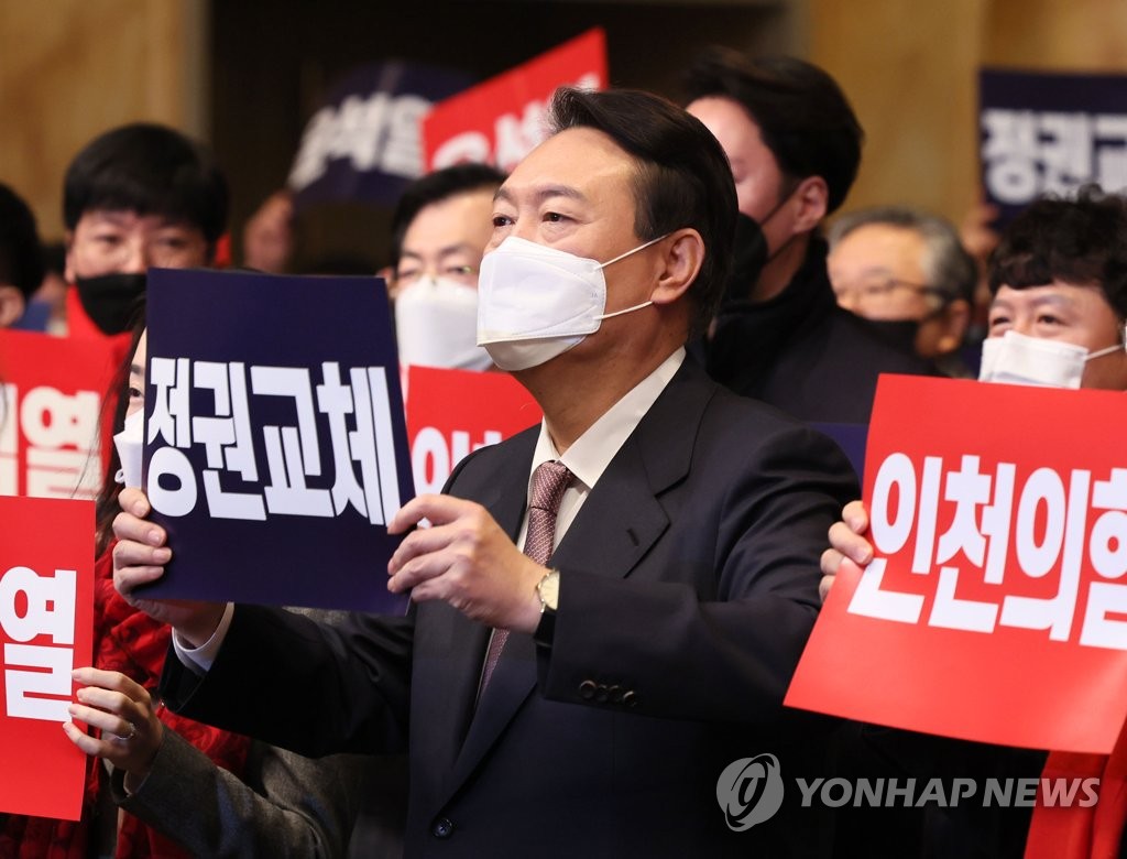 대선승리 퍼포먼스 하는 윤석열국민의힘 윤석열 대선 후보가 10일 오전 인천 연수구 송도센트럴파크호텔에서 열린 인천시 선거대책위원회 출범식에서 대선 승리를 위한 퍼포먼스를 하고 있다…