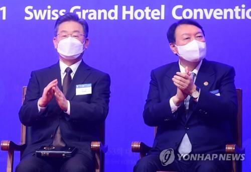 이재명·윤석열 대선후보더불어민주당 이재명 대선 후보(왼쪽)와 국민의힘 윤석열 대선 후보가 지난달 2일 오전 서울 서대문구 스위스그랜드호텔 컨벤션센터에서 열린 제53회 대한민국 국가…