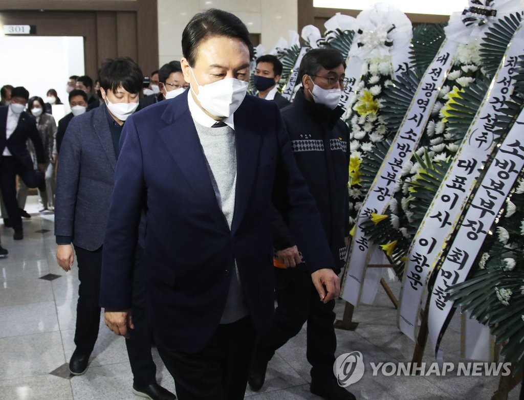 순직 소방관 빈소 찾은 윤석열-이준석국민의힘 윤석열 대선 후보와 이준석 대표가 6일 오후 경기도 평택시 제일장례식장에 마련된 평택 신축 공사장 화재 현장에서 순직한 소방관 빈소 조…