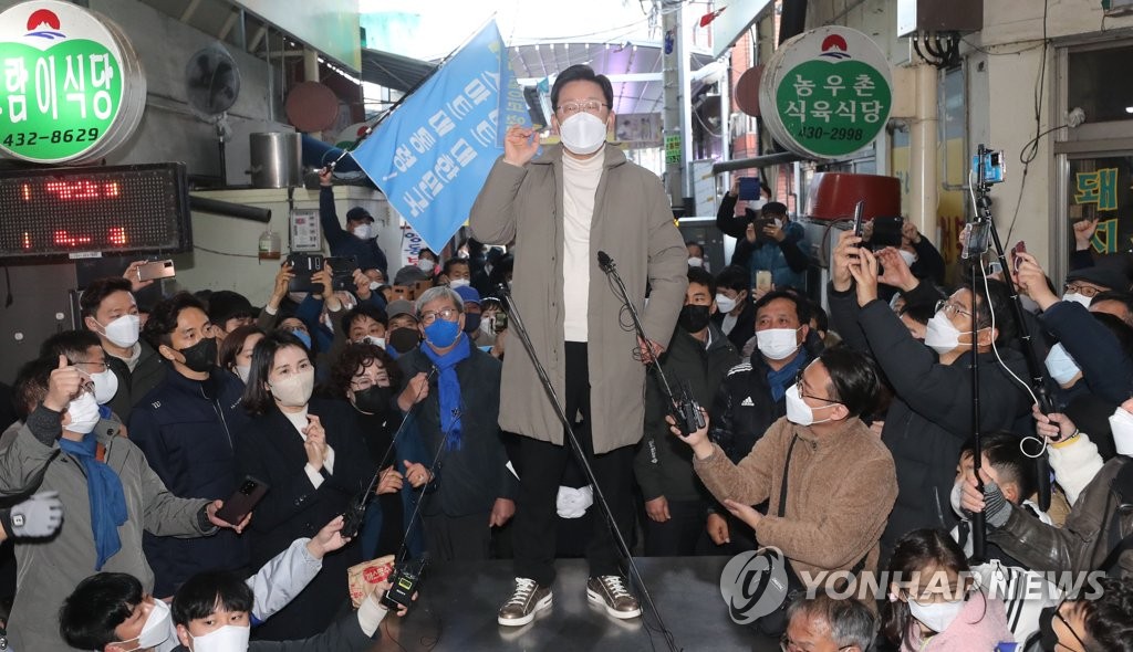 김천 황금시장 방문해 지지 호소하는 이재명 후보더불어민주당 이재명 대선 후보가 지난 12월 12일 조선시대 5대 시장으로 꼽히던 경북 김천시 김천 황금시장을 방문해 시민들에게 지지…