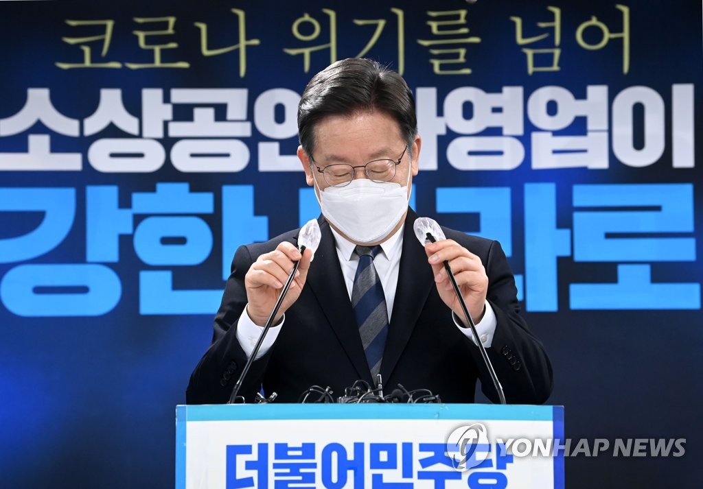 마이크 위치 조정하는 이재명 대선 후보더불어민주당 이재명 대선 후보가 지난 12월 20일 서울 여의도 중앙당사에서 열린 소상공인·자영업 정책 공약 발표 기자회견에서 마이크 위치를 …