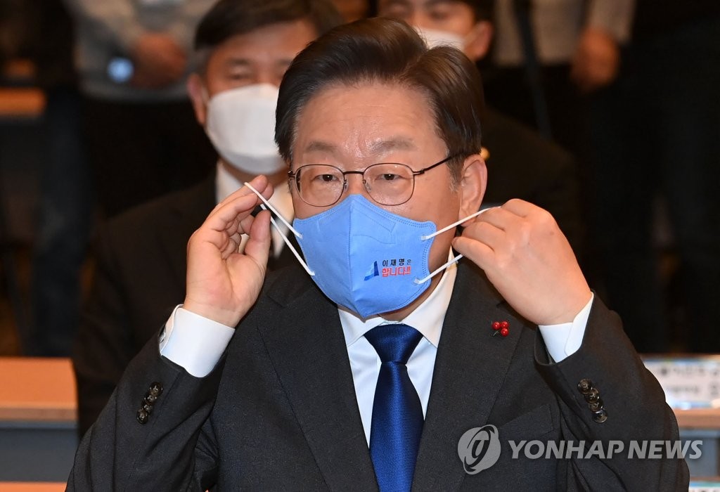 마스크 바꿔쓰는 이재명 대선후보더불어민주당 이재명 대선후보가 23일 서울 여의도 중소기업중앙회에서 열린 대한민국 대전환 직능본부 출범식에서 마스크를 바꿔쓰고 있다. 2021.12.…