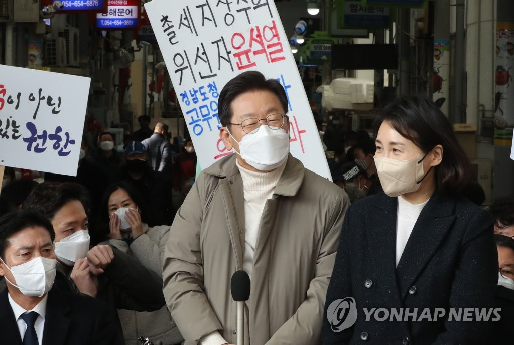 이재명, 코로나 검사 결과 음성…오후 의료현장 방문더불어민주당 이재명 대선후보와 부인 김혜경 씨가 지난 12일 오전 경북 예천군 예천읍 상설시장을 방문, 시민들에게 인사하고 있다.…