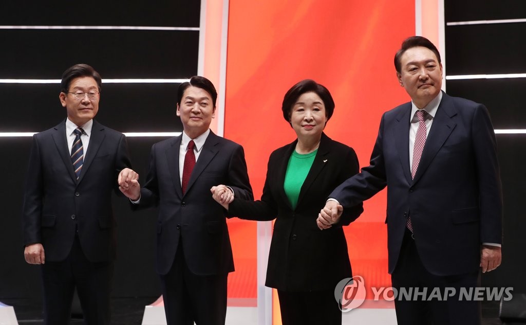 토론 앞서 포즈 취하는 대선 후보들21일 오후 서울 마포구 MBC 미디어센터 공개홀에서 열린 중앙선거방송토론위원회 주관 제20대 대통령선거 후보 초청 1차 토론회에 앞서 대선 후보…