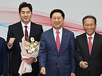 9일 국회에서 열린 국민의힘 최고위원 보궐선거에서 당선한 김가람 당 청년대변인이 김기현 대표, 윤재옥 원내대표와 기념촬영을 하고 있다.9일 열린 국민의힘 최고위원 보궐선거에서 김가…