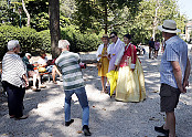 베네치아 비엔날레 현장에서 시그니처 한복을 입고 온 박경귀 아산시장과 이유영 문화예술과장이 외국인 관람객의 요청으로 사진을 찍고 있다유럽의 대표 문화예술 도시와의 교류협력과 공연예…