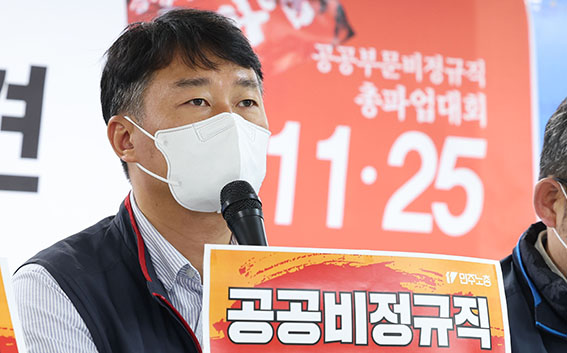 14일 오후 서울 중구 전국민주노동조합총연맹(민주노총)에서 열린 20만 공공부문 비정규직 총파업 투쟁선포 기자회견에서양경수 민주노총 위원장이 발언하고 있다.전국민주노동조합총연맹(민…