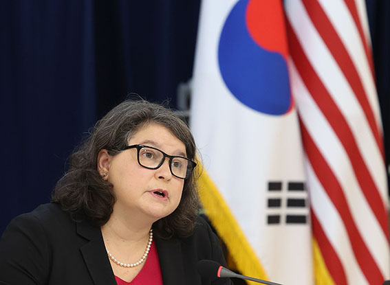 테아 로즈먼 켄들러 미국 상무부 수출 담당 차관보가 10일 오전 서울 용산구 남영동 미국대사관 아메리칸센터에서 기자간담회를 하고 있다.테아 켄들러 미국 상무부 수출관리 담당 차관보…