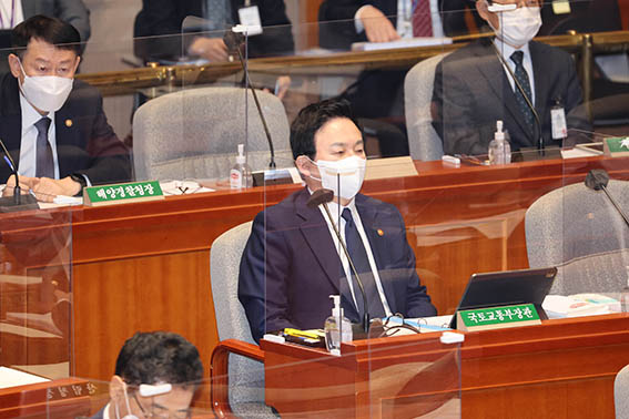 원희룡 국토교통부 장관이 10일 국회에서 열린 예산결산특별위원회 전체회의에 참석해 자리에 앉아 있다.원희룡 국토교통부 장관은 10일 공시가격 현실화 계획 수정 추진과 관련해 "12…
