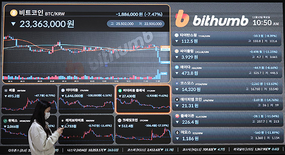 글로벌 가상화폐 거래소 FTX의 유동성 위기 여파로 10일 국내 가상화폐 시장에서도 급락세가 지속된 가운데10일 서울 서초구 빗썸 고객센터 전광판에 가상화폐 가격이 표시돼 있다.F…