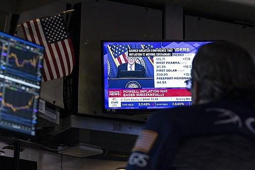 미국 연방준비제도(Fed·연준)제롬 파월 의장의 기자회견을 중계 중인 뉴욕증권거래소(NYSE)모니터 화면미국 연방준비제도(Fed·연준)의'빅컷'(0.5%포인트 금리인하)에도 금융시…