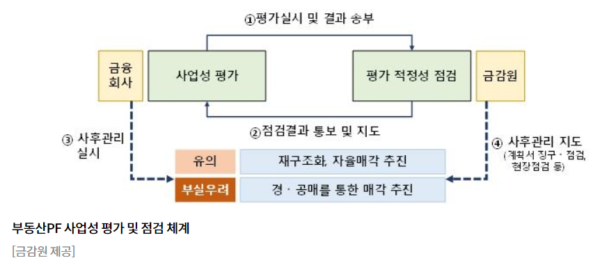 금융당국은 현행 사업성 평가 등급은 3단계(양호·보통·악화우려)에서 4단계(양호·보통·유의·부실우려)로 세분화하고, 사업성 부족 사업장(유의·부실우려)에 대한 적극적인 사후관리를 유도하기로 했다.
