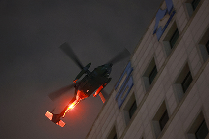 윤석열 대통령이 3일 밤 긴급성명을 통해 비상계엄을 선포한 가운데 4일 새벽 국회가 위치한 여의도 상공을 군 헬기가 비행하고 있다.4일 윤석열 대통령의 비상계엄 선포에서 국회의 계…