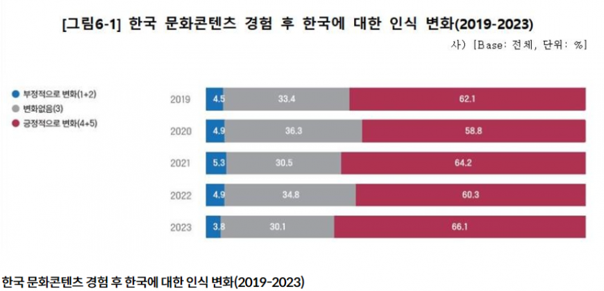 문화체육관광부와 한국국제문화교류진흥원이 2일 발표한 '2024 해외 한류 실태조사'(2023년 기준)에 따르면 해외에서 한국 문화콘텐츠를 접한 응답자 가운데 한국에 대한 인식이 '긍정적으로 변화'했다는 비율이 66.1%로 조사됐다.