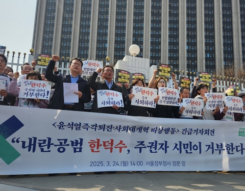 비상행동 '한덕수 권한대행 직권남용, 이완규 법제처장 내란죄 등 고발' 기자회견한덕수 대통령 권한대행 국무총리가 대통령 몫인 헌법재판관 후보자 2명을 지명한 데 대해 시민사회단체가…