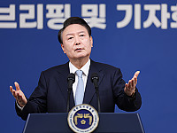 윤석열 대통령이 29일 오전 서울 용산 대통령실 청사에서 열린 '국정브리핑 및기자회견'에서 질문에 답하고 있다.윤석열 대통령은 29일 용산 대통령실에서 국정브리핑 및 기자회견을 열…