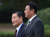 신원식 국가안보실장(왼쪽)과 김태효 국가안보실1차장이19일 성남 서울공항에서 윤석열 대통령의 체코 공식 방문 수행을 위해 대통령 전용기인 공군1호기로 향하고 있다.대통령실은23일 …