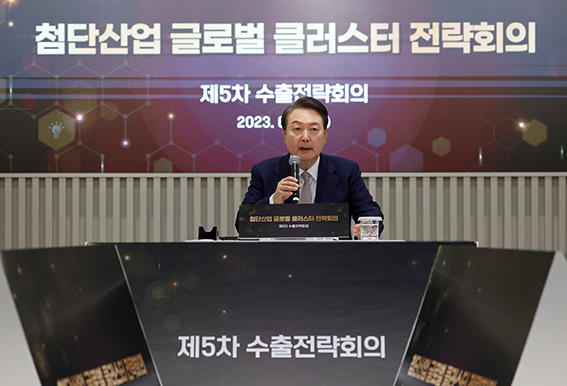윤석열 대통령이 1일 서울 강서구 서울창업허브 엠플러스에서 열린 제5차 수출전략회의에서 발언하고 있다.윤석열 대통령은 1일 제5차 수출전략회의를 주재하고 한국판 '보스턴 클러스터'…