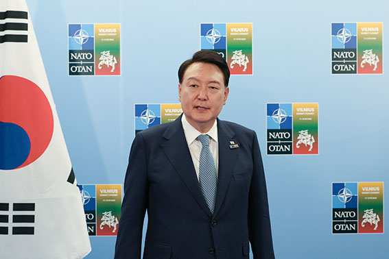 북대서양조약기구(NATO·나토) 정상회의에 참석하는 윤석열 대통령이 지난 11일리투아니아 빌뉴스 나토 정상회의장에서 가진 옌스 스톨텐베르그 나토 사무총장과의 면담에 앞서 발언하고 …