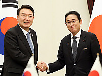 북대서양조약기구(NATO·나토) 정상회의 참석차 리투아니아를 방문 중인 윤석열 대통령이 12일 빌뉴스 한 호텔에서 열린한일 정상회담에서 기시다 후미오 일본 총리와 악수하고 있다.정…