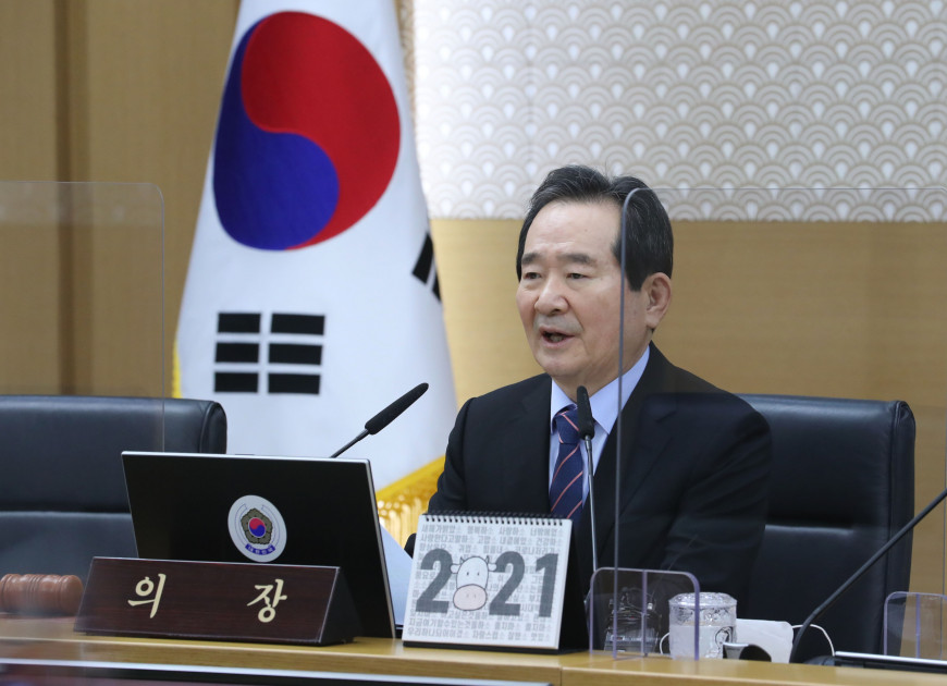 (세종=연합뉴스) 김주형 기자 = 정세균 국무총리가 9일 오전 세종시 정부세종청사에서 서울과 영상으로 연결해 열린 국무회의를 주재하며 발언하고 있다. kjhpress@yna.co.kr