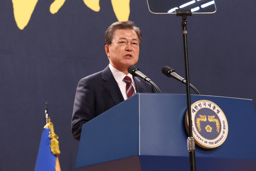 (아산=연합뉴스) 이진욱 기자 = 문재인 대통령이 12일 오후 충남 아산시 경찰대학에서 열린 신임 경찰 경위·경감 임용식에 참석, 축사하고 있다. 2021.3.12 cityboy@yna.co.kr
