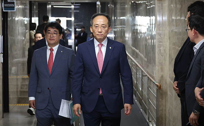 국민의힘 추경호 원내대표가 5일 오후 국회에서 열린 의원총회에 참석하고 있다.국민의힘은 5일 22대 국회 첫 본회의에서 진행될 전반기 국회 의장단 선출 표결에 참여하지 않기로 했다…
