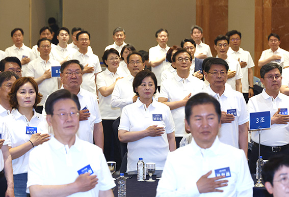 22일 충남 스플라스리솜에서 열린 제22대 국회 더불어민주당 당선인 워크숍에서 이재명 대표와 당선인들이 국민의례를 하고 있다.더불어민주당의22대 국회 당선인들이22일 한자리에 모여…