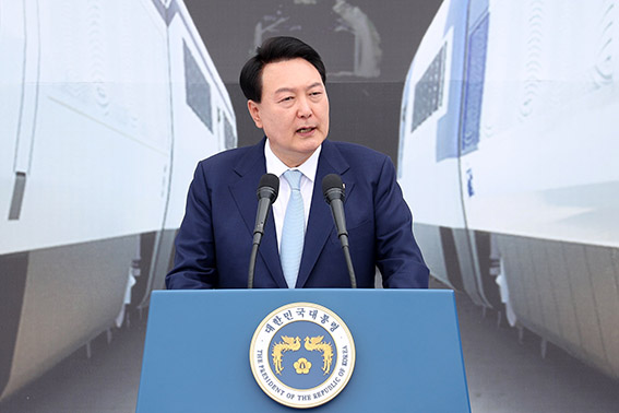 윤석열 대통령이 7일 충북 청주시 청원구 문화제조창 중앙광장에서 열린 평택-오송 고속철도 2복선화 사업 착공 기념식에서 기념사를 하고 있다.윤석열 대통령은 7일 "이제 청주와 충북…