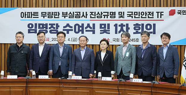 국민의힘 윤재옥 원내대표가4일 오전 국회에서 열린 아파트 무량판 부실공사 진상규명 및 국민안전TF임명장 수여식 및1차 회의에서 김정재 위원장을 비롯한 위원들과 기념촬영을 하고 있다…