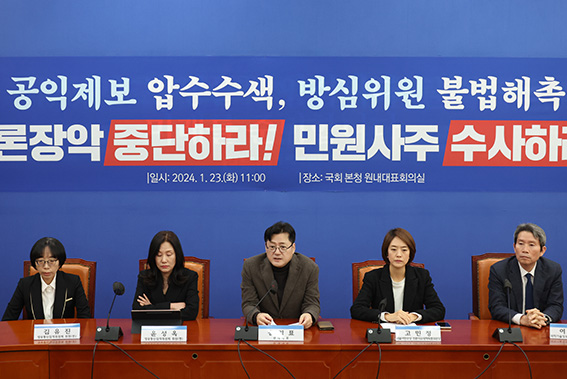 더불어민주당 홍익표 원내대표가23일 국회에서 열린 방심위원 불법 해촉 대응 긴급간담회에서 발언을 하고 있다.더불어민주당은23일 류희림 방송통신심의위원장의'청부 민원'의혹에 문제를 …