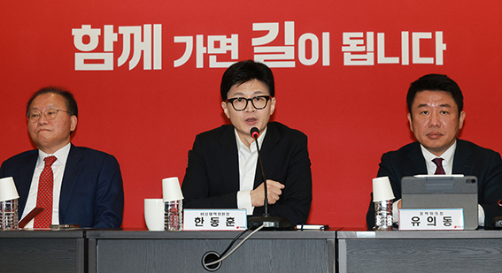 국민의힘 한동훈 비상대책위원장이22일 국회에서 비대위 회의를 하고 있다.윤석열 대통령 부인 김건희 여사의 명품 가방 수수 논란에 대한 김경율 비상대책위원 발언이 윤 대통령과 국민의…