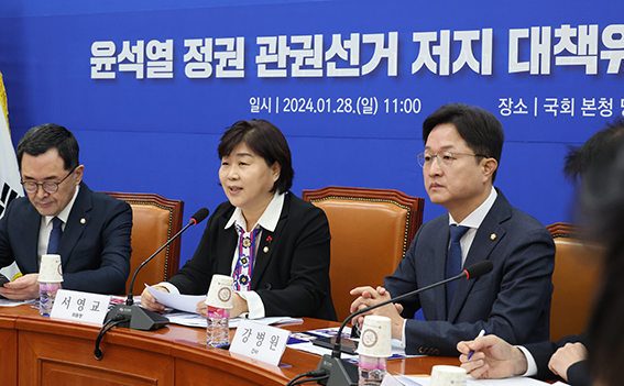 더불어민주당 서영교 관권선거 저지 대책위원장이28일 국회에서1차 회의를 하고 있다.더불어민주당은28일 대통령실의 국민의힘 한동훈 비상대책위원장 사퇴 요구가 공직선거법 위반이라고 주…