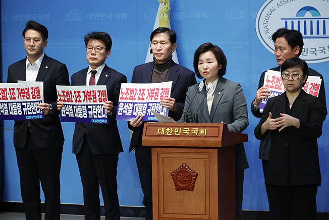 민주당 환노위 위원들, 노조법 거부권 행사 규탄 회견더불어민주당은 1일 정부가 임시 국무회의에서 '노란봉투법'과 방송3법에 대한 재의요구안(거부권)을 의결한 데 대해 "윤석열 대통…