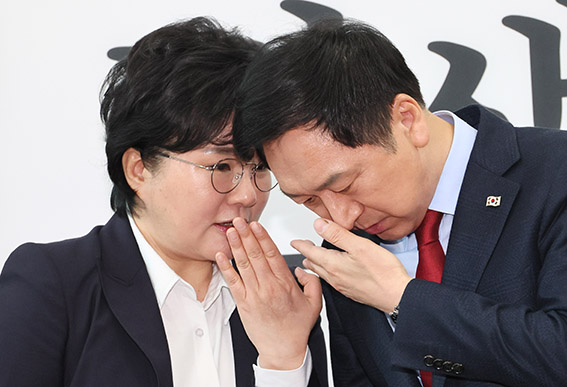 국민의힘 김기현 대표가조수진 최고위원과 대화하고 있다.국민의힘 지도부에서 잇단 '자책골'이 터지면서 당 안팎의 경고음이 커지고 있다.지난 3·8 전당대회를 통해 출범한 '김기현호(…