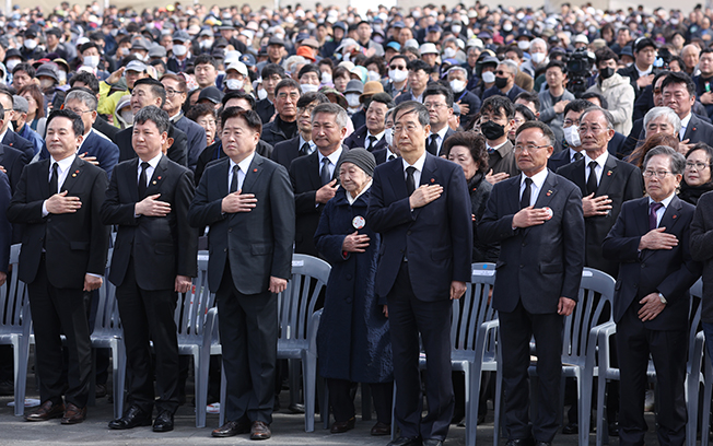 한덕수 국무총리와 참석자들이 3일 오전 제주시 명림로 4·3 평화공원에서 열린 4·3 희생자 추념식에서 국기에 경례하고 있다.윤석열 대통령은 제주 4·3 75주년을 맞은 3일 "정…