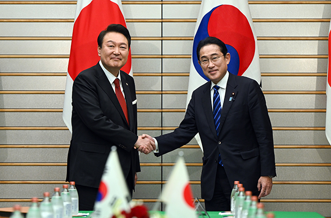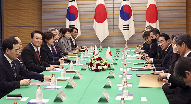 1박2일 일정으로 일본을 방문한 윤석열 대통령이 16일 오후 일본 도쿄 총리 관저에서 기시다 후미오 일본 총리와 한일 확대 정상회담을 하고 있다.한일 양국이 16일 윤석열 대통령의…