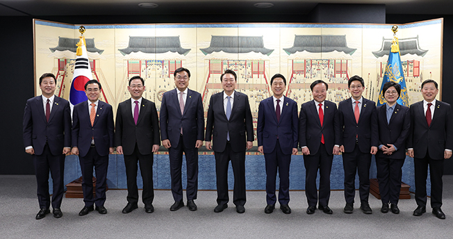 윤석열 대통령이 13일 오후 서울 용산 대통령실 청사에서 열린 국민의힘 신임 지도부 초청 만찬에서 김기현 대표 등과 기념촬영을 하고 있다.윤석열 대통령과 국민의힘 신임 지도부의 지…