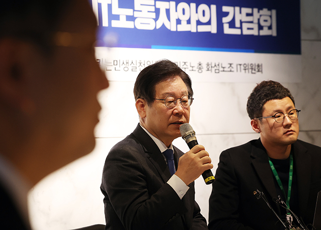 더불어민주당 이재명 대표가 14일 오전 경기도 성남시 워크앤올 그레이츠판교점에서 열린'주69시간 장시간 노동, 크런치모드 확대 방지를 위한 IT노동자와의 간담회'에서 발언하고 있다…