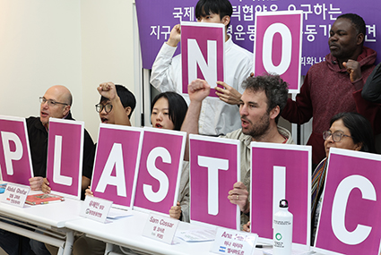 플라스틱 반대 구호 외치는 환경운동가들25일부터 부산 벡스코에서 열리는 플라스틱 오염 종식 국제협약을 위한 제5차 정부 간 협상위원회에 조태열 외교부 장관을 수석대표, 김완섭 환경…