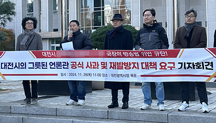 대전시 언론관 비판 기자회견 하는 시민단체대전충남민주언론시민연합(이하 민언련) 등 시민단체 등이 공식 석상에서 시정 비판 보도에 항의 의사를 나타낸 대전시 A국장에 대해 공식 사과…