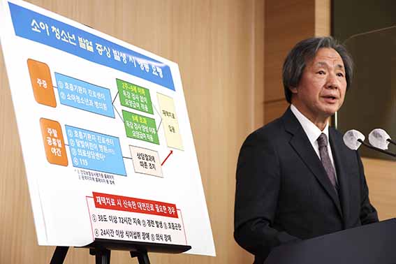 정기석 코로나19 특별대응단장 겸 국가감염병위기대응자문위원장이 24일 정부서울청사 브리핑실에서소아 청소년 발열 증상 발생시 행동 요령에 관한 브리핑을 하고 있다.