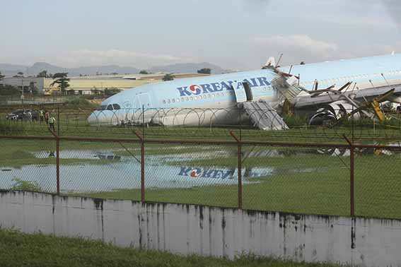 24일 필리핀 세부 막탄공항에서 활주로를 이탈한 뒤 멈춘 대한항공 여객기가 바닥에 처박혀 있다.173명의 승객이 탑승한 문제의 여객기는 기상 악화 탓에 막탄 공항에 착륙한 직후에 …