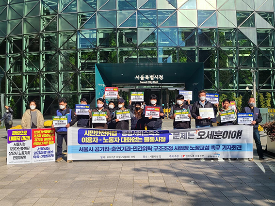 서울시 공기업-출연기관-민간위탁 구조조정 사업장 노정교섭 촉구 기자회견전국민주노동조합총연맹(민주노총) 서울본부와 공공운수노조는 25일 오전 서울시청 앞에서 기자회견을 열고 서울시 …