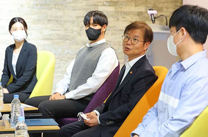 이정식 고용노동부 장관이 21일 오후 서울 광진구 세종대학교 대학일자리플러스센터를 방문해 청년들과 간담회를 하고 있다.이정식 고용노동부 장관은 청년 주간(9월 17∼23일)을 맞아…