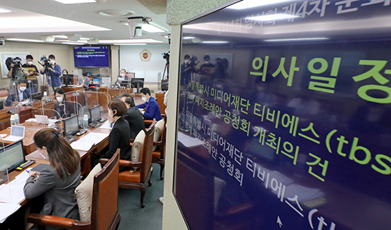 지난달 26일 서울시의회 의원회관에서 TBS 조례 폐지조례안 공청회가 열리고 있다.서울시의회 국민의힘이 제출한 'TBS(교통방송) 지원 중단' 조례안에 맞서 더불어민주당이 TBS에…