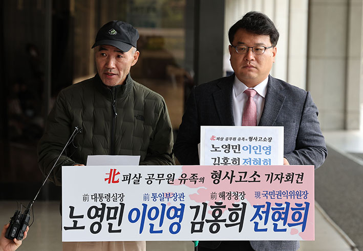 지난 2020년 서해상에서 북한군에 피살된 공무원 고(故) 이대준 씨의 친형 이래진 씨(왼쪽)가 6일 오전 서울중앙지검에서 노영민 전 대통령 비서실장, 이인영 전 통일부 장관, 김…