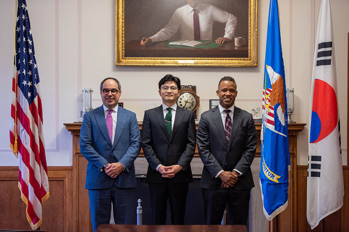 한동훈 법무부 장관(가운데)이 7월 1일 미국 연방법무부를 방문, 조나단 캔터 미국 연방법무부 차관보 겸 반독점 국장(왼쪽), 케네스 폴라이트 2세 차관보 겸 형사국장과 면담 후 …